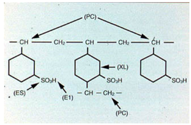 圖3、磺酸強酸陽離子樹脂(Amberlite lR-120),(XL)的化學結構式:交X聯;(PC):聚合物鏈;(ES):交換網站;(EI):可交換離子。